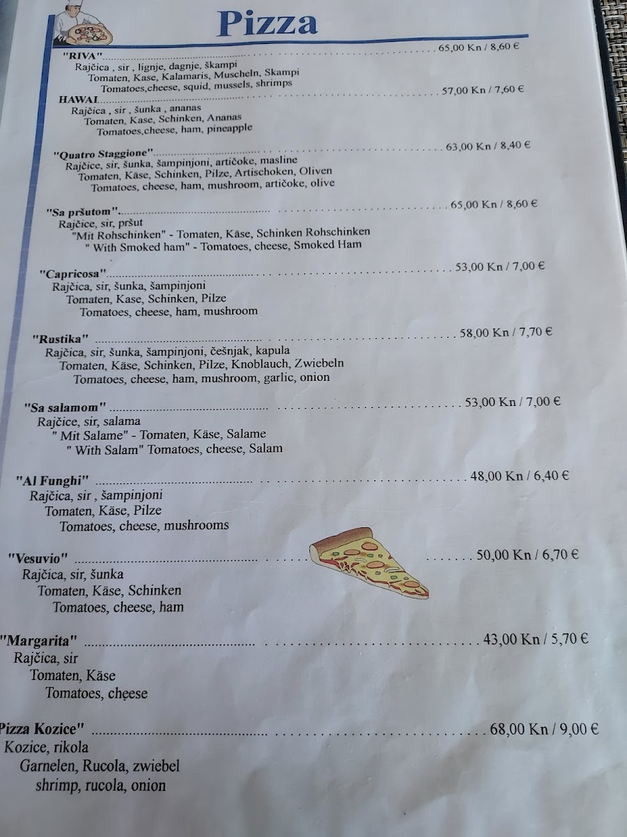 Welcome to Pizzeria Riva, a hidden gem nestled in the heart of Vodice, Croatia. Operating out of a prime location on Dulcin ul., this restaurant promises an unforgettable dining experience. Savvy diners rave about its tantalizing pizza, bursting with flavorful toppings and expertly crafted sauces. Fans of hearty dishes will also delight in the pastas and specialties like Rižoto Plodova Mora and Lignje na Žaru, known for their generous portions and delightful flavors.